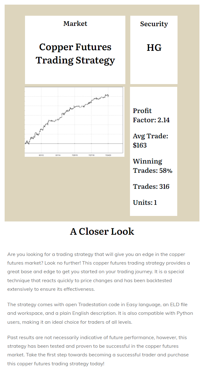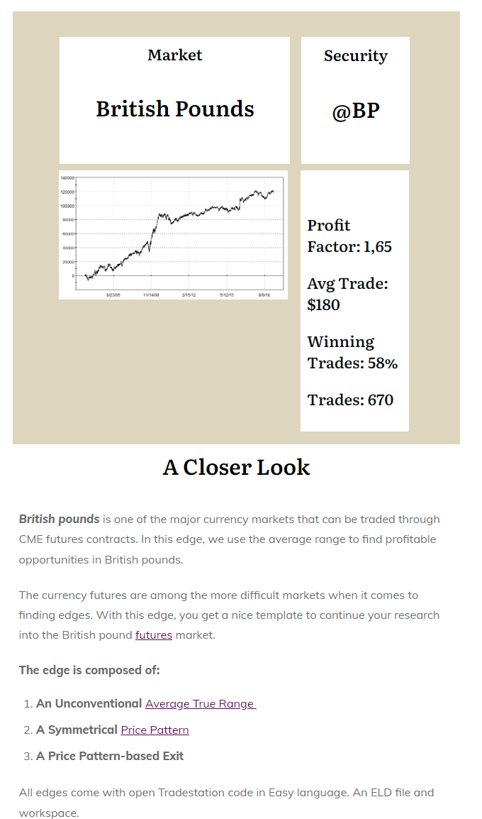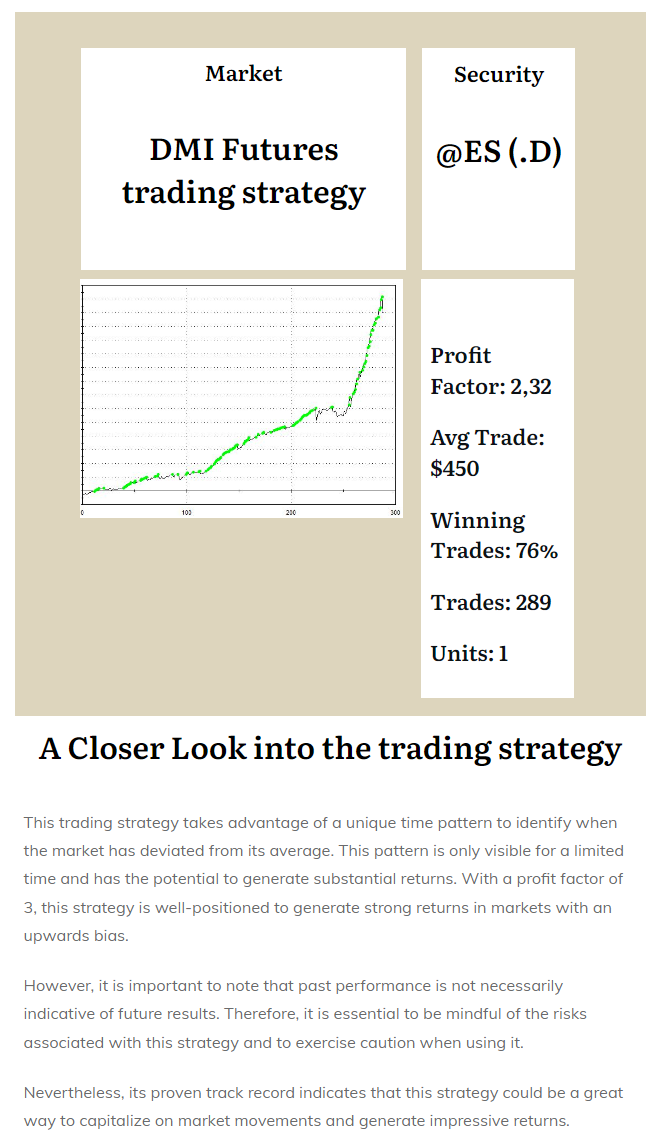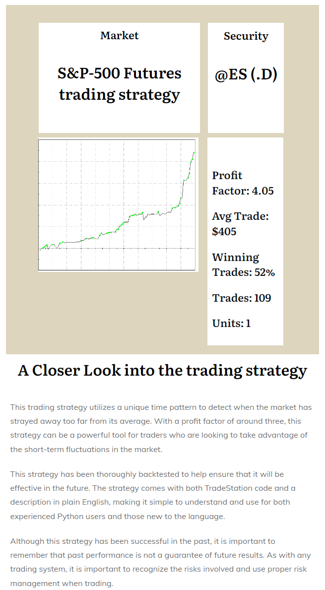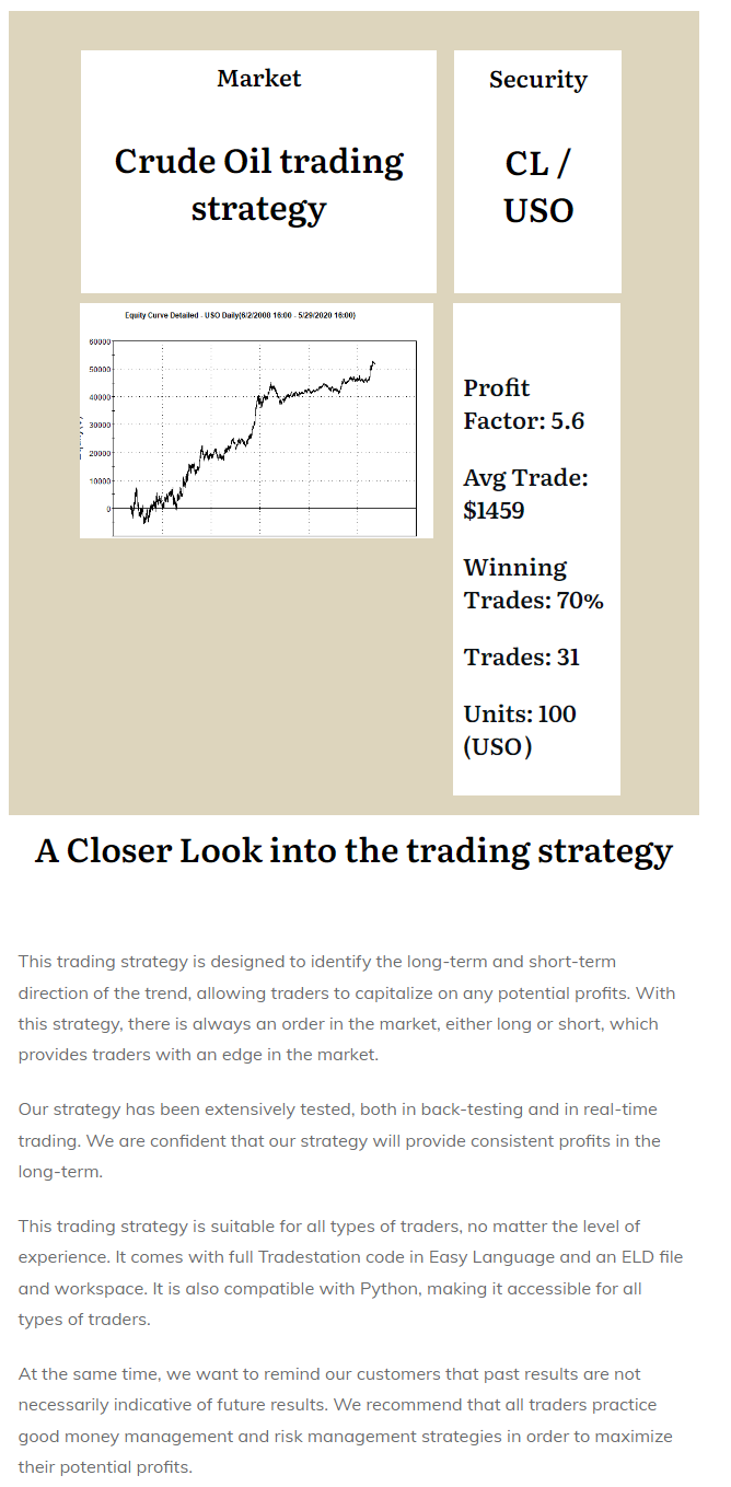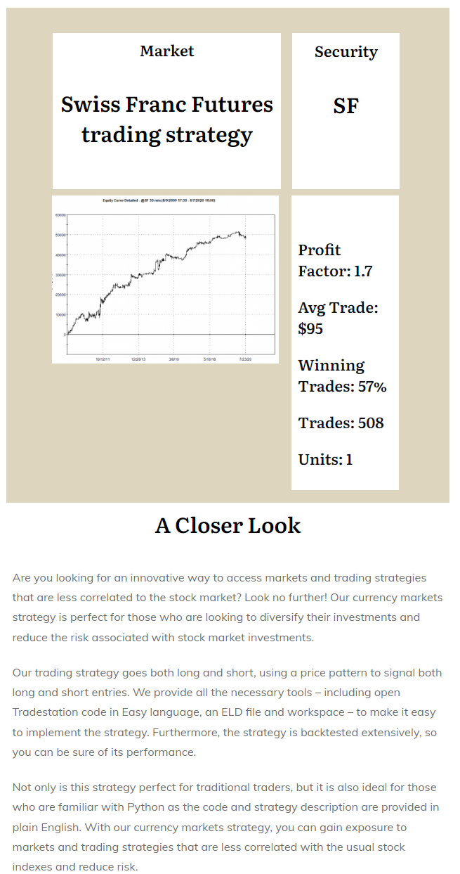 Each Futures Trading Strategy comes with trading rules in plain English and strategy code for Tradestation/Easy Language (others on demand). Commissions and slippage are not included in the backtests (estimated commissions and slippage).