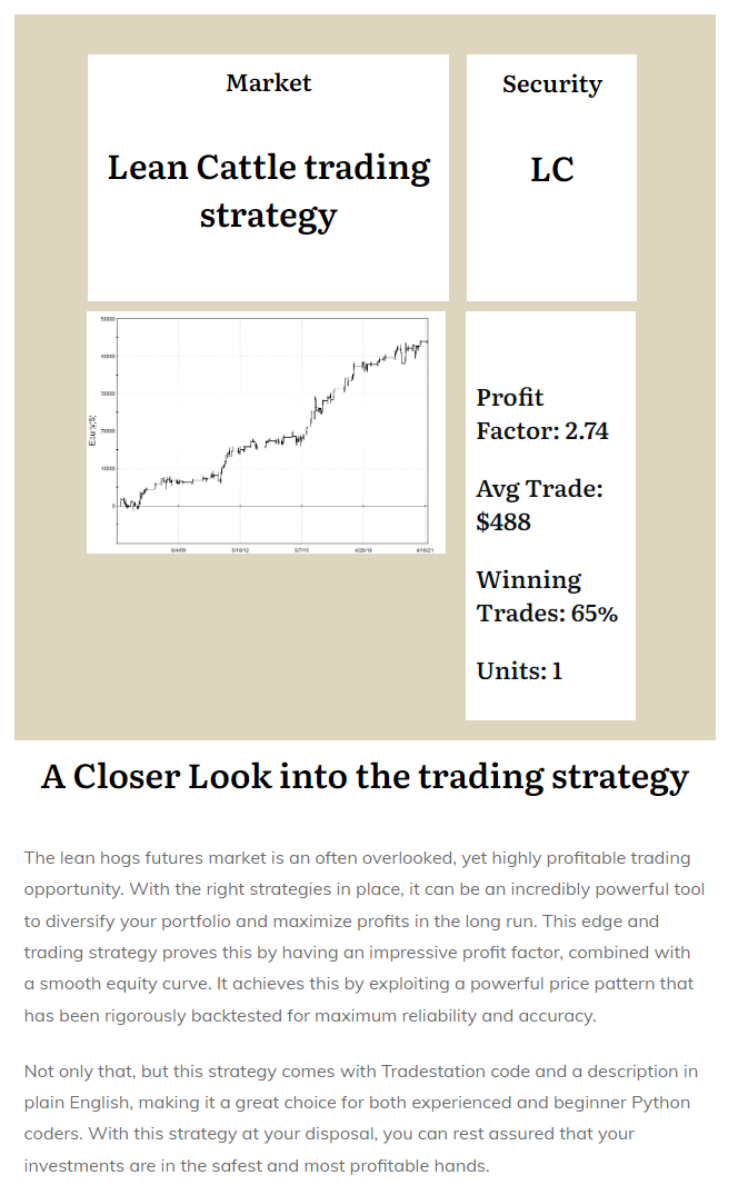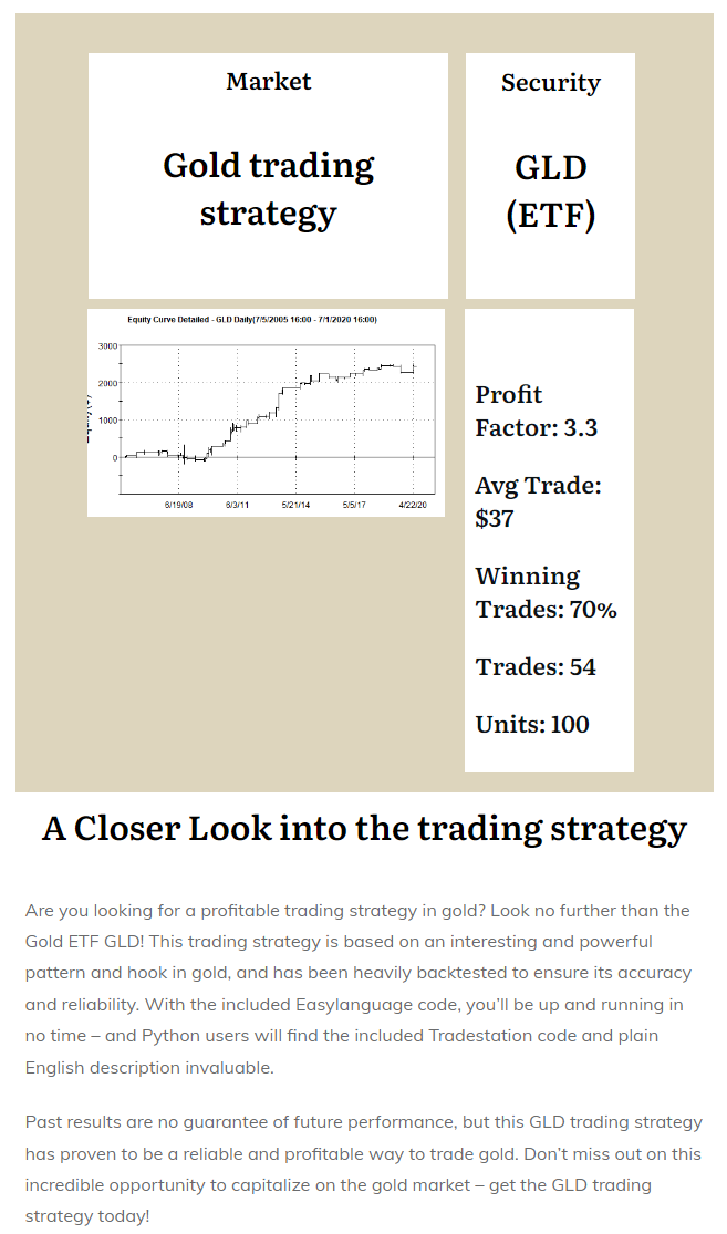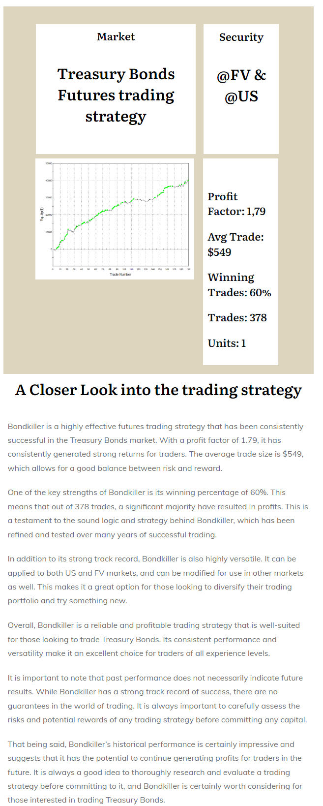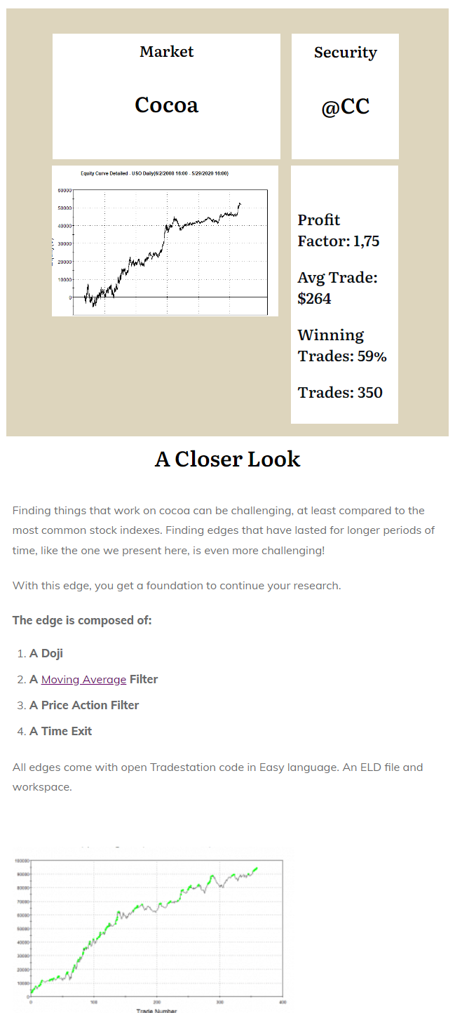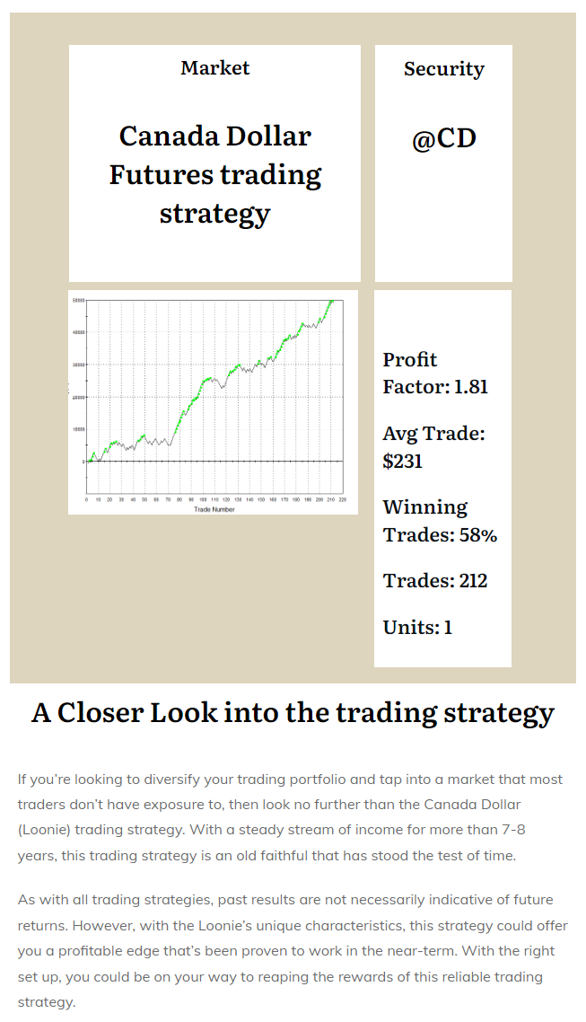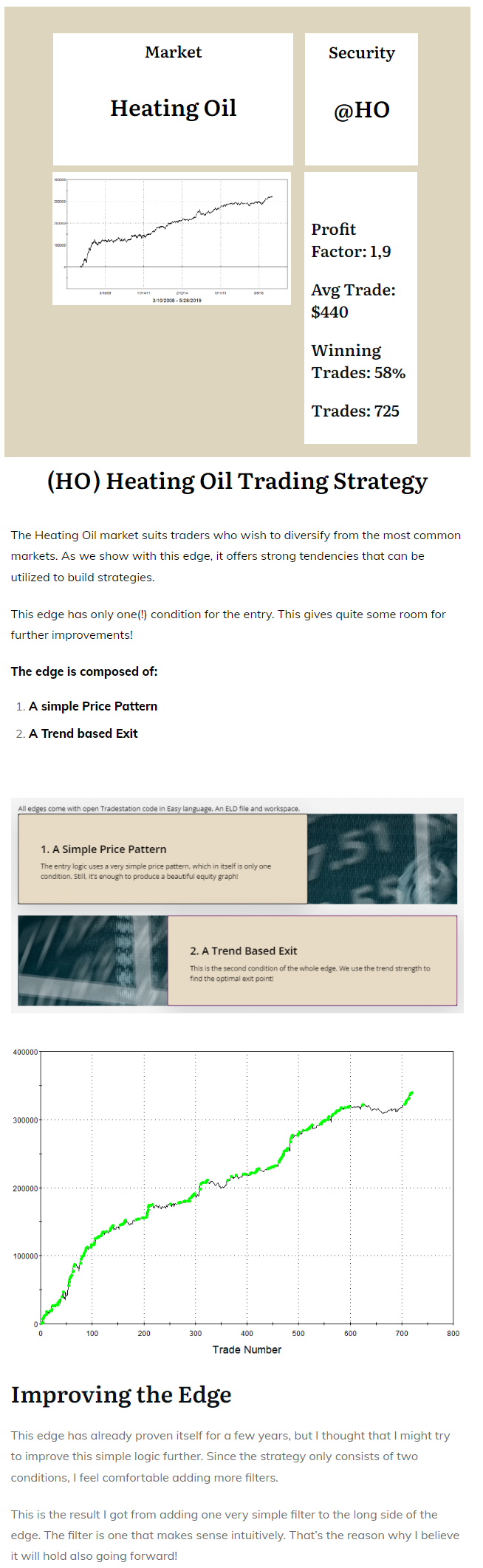 Each Futures Trading Strategy comes with trading rules in plain English and strategy code for Tradestation/Easy Language (others on demand). Commissions and slippage are not included in the backtests (estimated commissions and slippage).