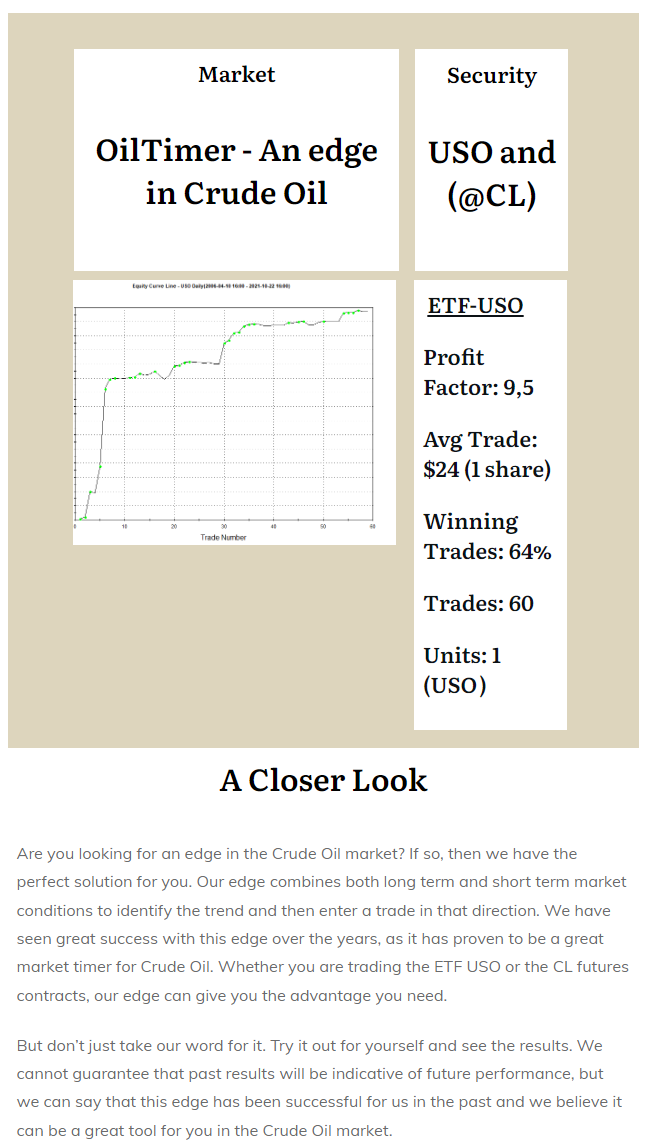 The backtest trades at the close, is based on daily bars, and is from the contract’s inception until today. The strategy can also be traded on tomorrow’s open, but performs slightly worse with this setting.