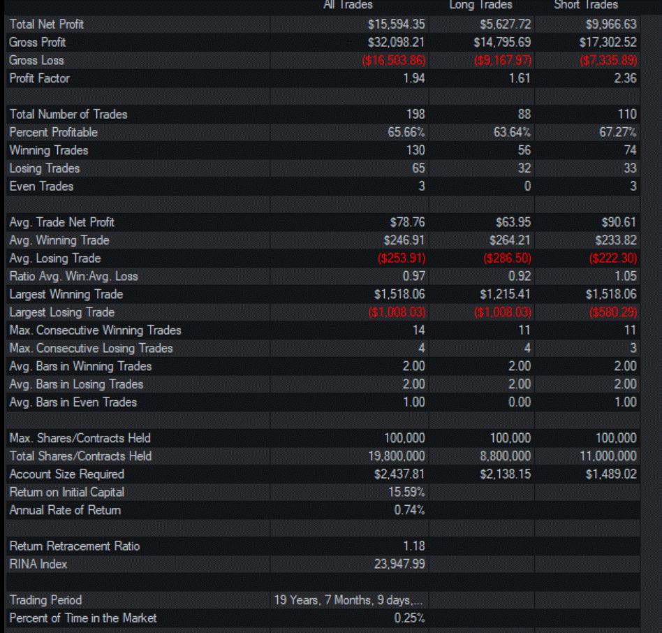 The strategy uses a rather odd time frame, but the trading statistics and performance metrics are pretty good: