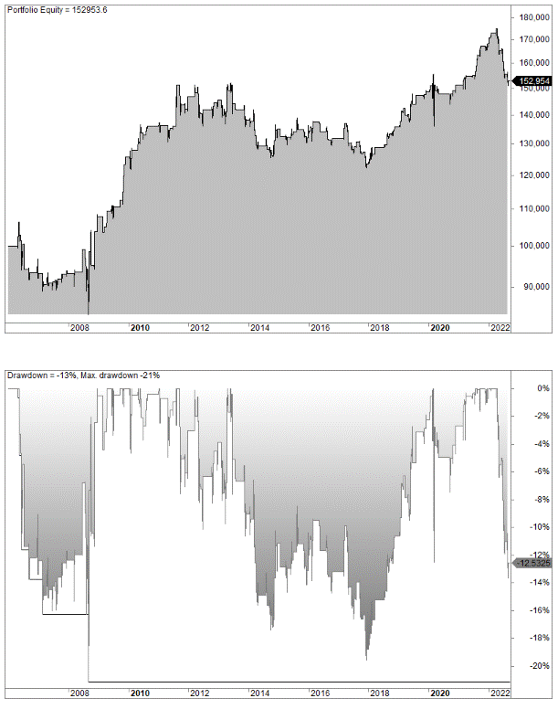 The trading strategy buys on strength, the opposite of mean reversion, and has a positive expectancy. But the equity curve is pretty erratic and is nowhere near a tradable trading strategy.