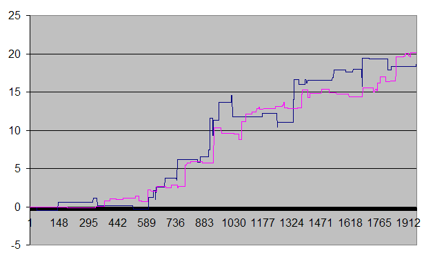 As you can see from the numbers the win ratio is not fantastic. I have fade the gap strategies that have a much better win-ratio. But the best part is that this simple strategy has a high number of very big winners. And I’m using only open and close so it should not be any big errors in the quotes (from Yahoo!finance). I have traded a twist to this strategy before with success, but this one looks better. The bigger the gap, the better it works. And the more volatile move before, the better, so this can probably be improved.
