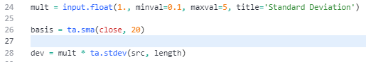 From here on, we have the development of the standard deviations! First, we use the ta.stedv() function to which we will add a multiplier, the one with which we define the bands themselves: