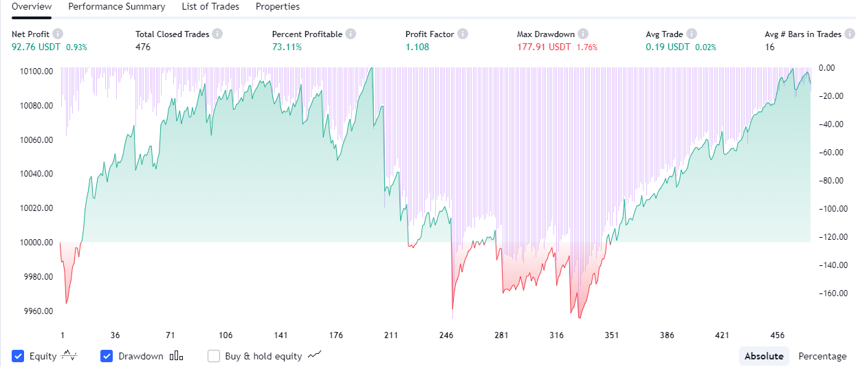 It’s time to click on “Add to chart” in the Pine Script editor and voila! Our strategy is already giving us results. We have useful data such as the equity curve, net profit, drawdown, and win rate at our fingertips.