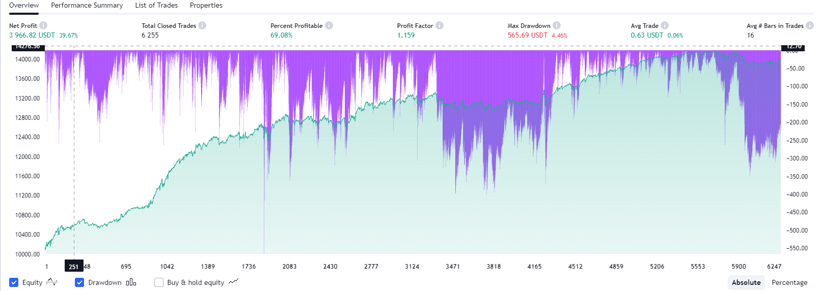 If we have a Pro or better account, we can run a “deep backtest”, which is limited to the historical data available on TradingView for a particular asset. For DOT, we have data since 2019 and can see the performance historically. We can use specific date intervals or simply run our logic from the first available day with data for the asset. The curve of our strategy is much more promising with a larger amount of historical data, which allows us to model and optimize our strategies better.