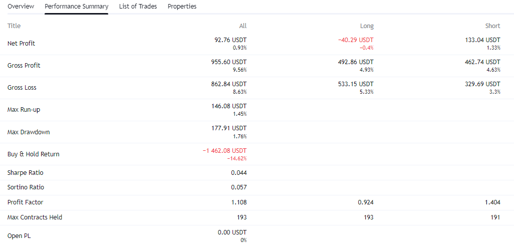 In the Performance Summary tab, we will find statistics about our strategy, such as Sharpe Ratio, Average R:R, and much more. In the List of Trades, we can see all the trades performed by the backtest and even export all this data in CSV format to analyze it separately.
