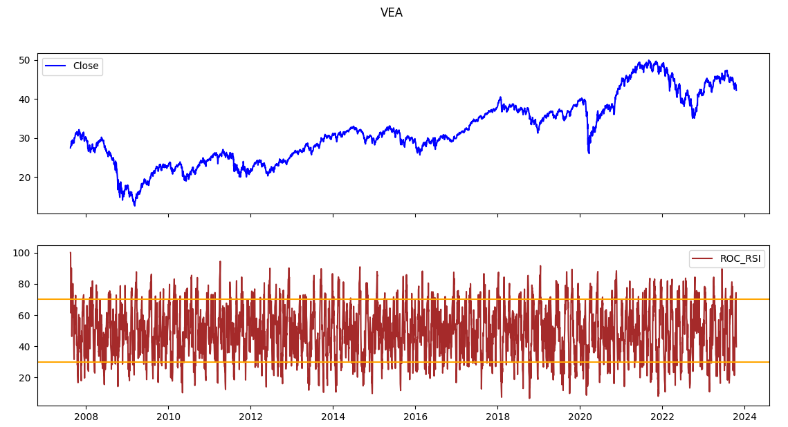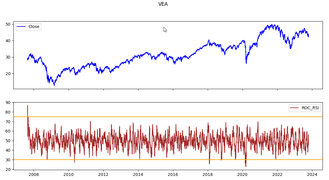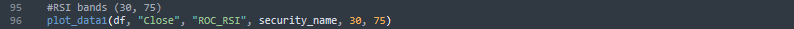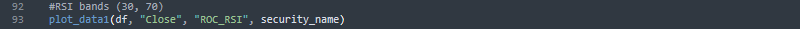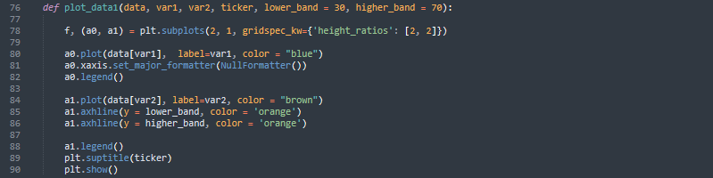 After adding some modifications to the plot_data function, the following image shows the plot_data1 function. It plots at the top the closing price and the RSI below with 30% and 70% bands.