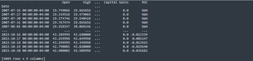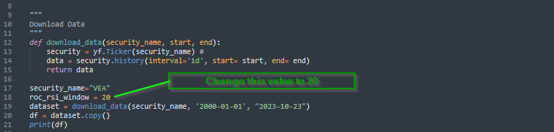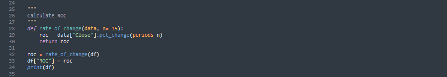 The following image illustrates the rate_of_change function, which calculates the Rate of Change (ROC). The panda’s method .pct_change(period=n) calculates the ROC between the current value and the value from 15 periods back. When n=15 means the percentual variation between the period analyzed and 15 days back.