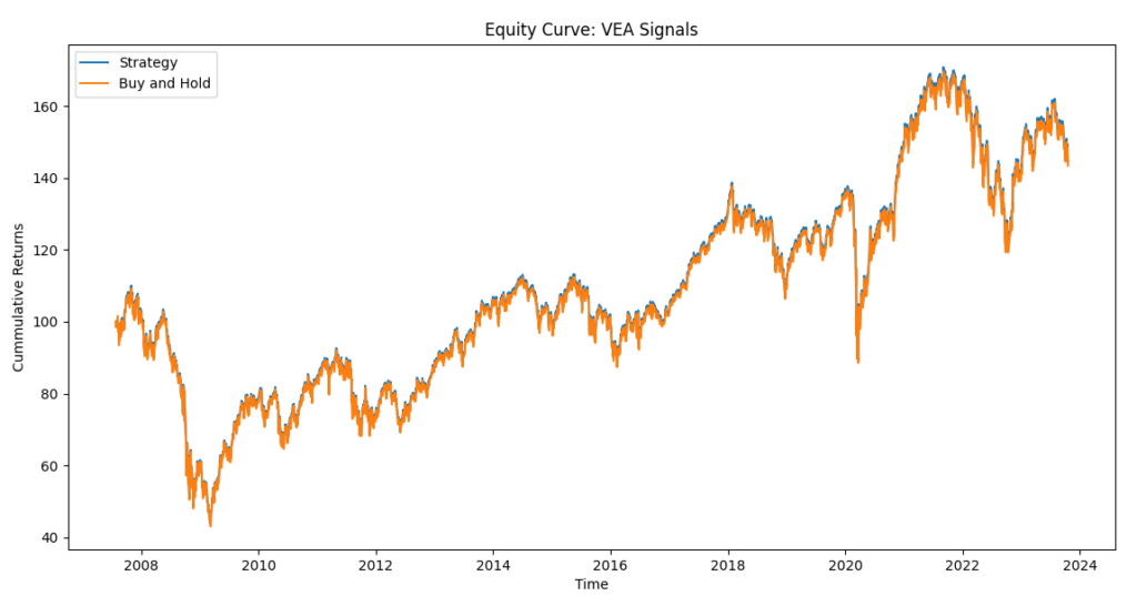 The equity equity curve is very similar because the strategy generates long positions and tracks its historical price.