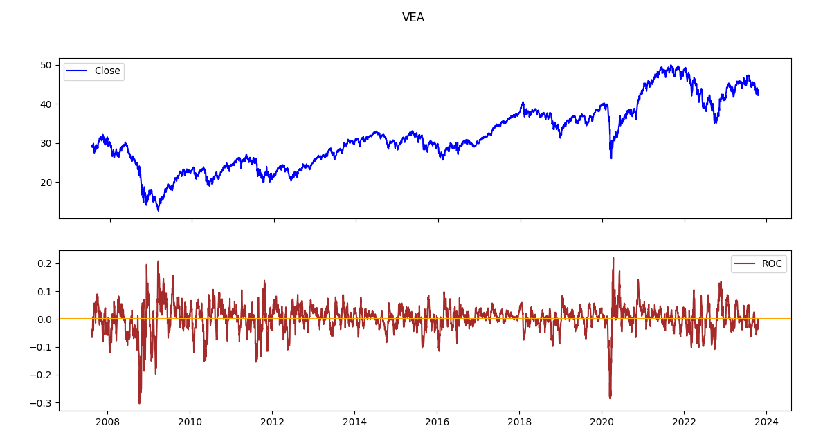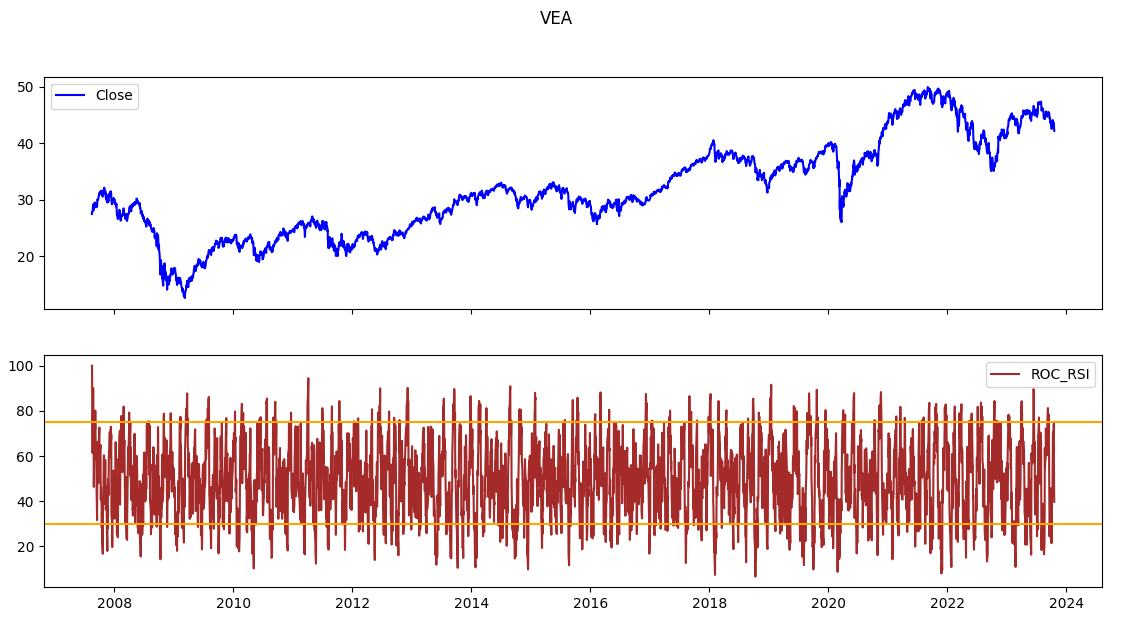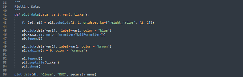 To plot the closing price and the ROC in the same chart is necessary to implement the plot_data function. This function has two charts, at the top, the closing price, and at the button, the indicator.
