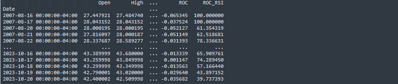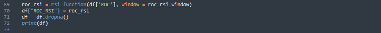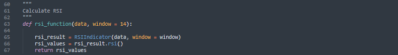 The following function estimates the RSI with the values from the Rate of Change. The rsi_function function uses the RSIIndicator class from the ta Python library to calculate the RSI. It has 14 periods (window=14) as a default look-back window.