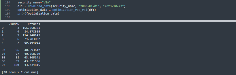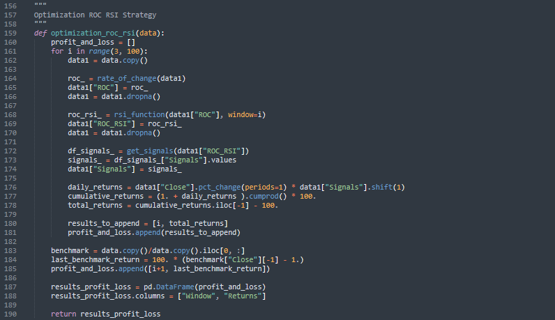 The function optimization_roc_rsi calculates the total return for each strategy nominated in the previous paragraph. The function body has the code already discussed in this article. The variable last_benchmark_return appends the buy-and-hold strategy total profit and loss.
