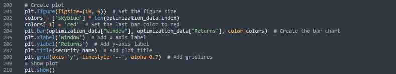 The following image shows the code to plot the returns of each strategy. The term colors[-1] = ‘red’ changes the color from the last bar, which is the buy-and-hold strategy.