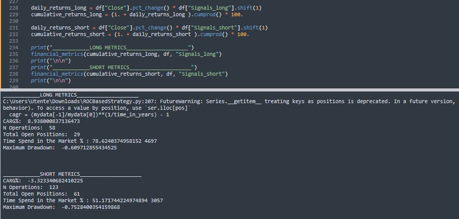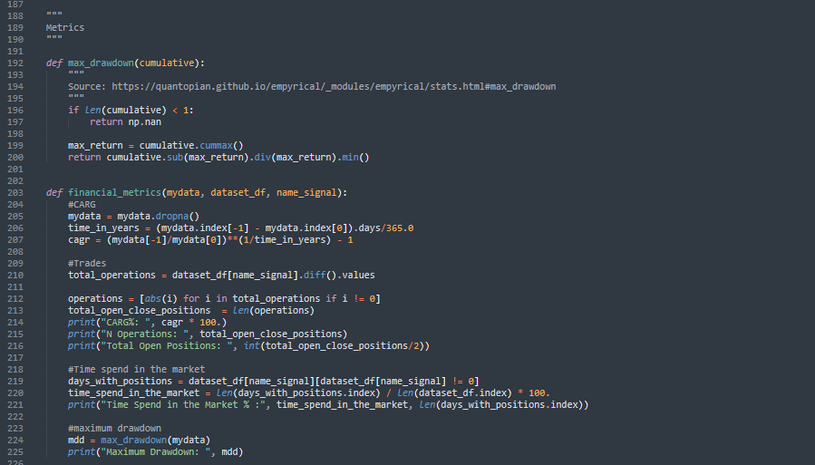 Before moving to the next section, it is convenient to check some trading metrics. The financial_metrics function calculates the CARG, total trades, total open positions, time spent in the market, and maximum drawdown.