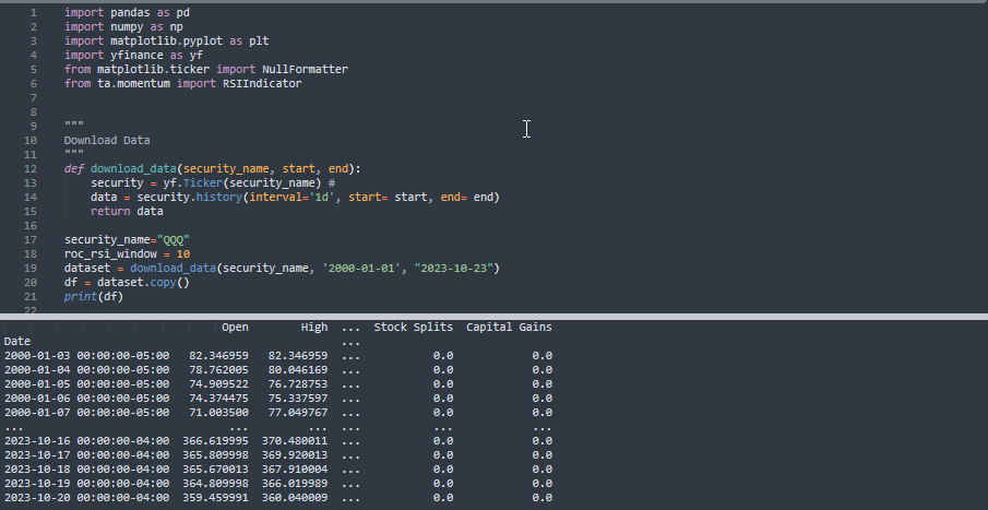 This article will use the Invesco QQQ Trust Series 1 (QQQ) ETF. As in the previous tutorial, the first step is to import the libraries and download the historical data: