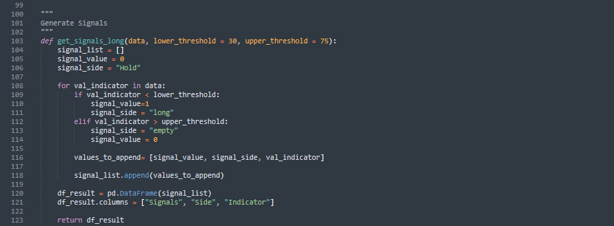 The get_signals_long function will generate a Python lit with 0 or 1 signals_list. Whenever the RSI’s values are under lower_threshold, signal_list will append 1, which indicates a long position. Otherwise, signal_list will append 0, which indicates without a position. Finally, get_signals_long will transform signal_list into a data frame df_result.