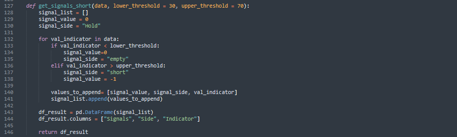 In case you are interested in backtesting a short trading strategy. The get_signals_short function. It is necessary to indicate with minus one signal_value = -1 when the RSI is higher than the upper threshold val_indicator > upper_threshold. Otherwise val_indicator < lower_threshold, the signal will be zero.