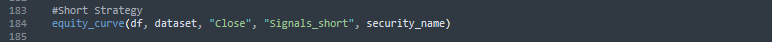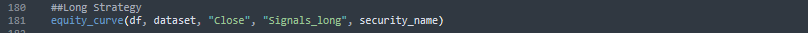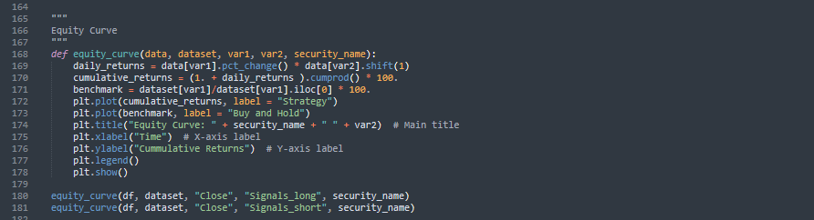 The following image shows the equity_curve function. This function plots the performance of the strategy and the buy-and-hold strategy.