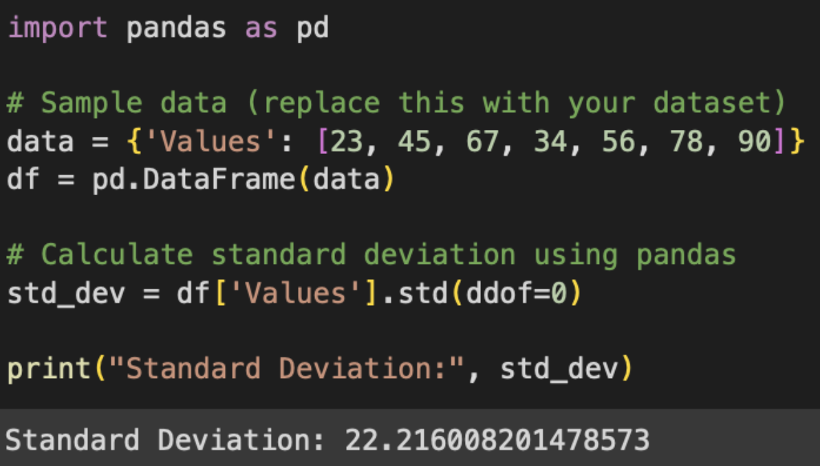 If your data is in a structured format like a DataFrame, pandas provide a convenient method to calculate the standard deviation.
