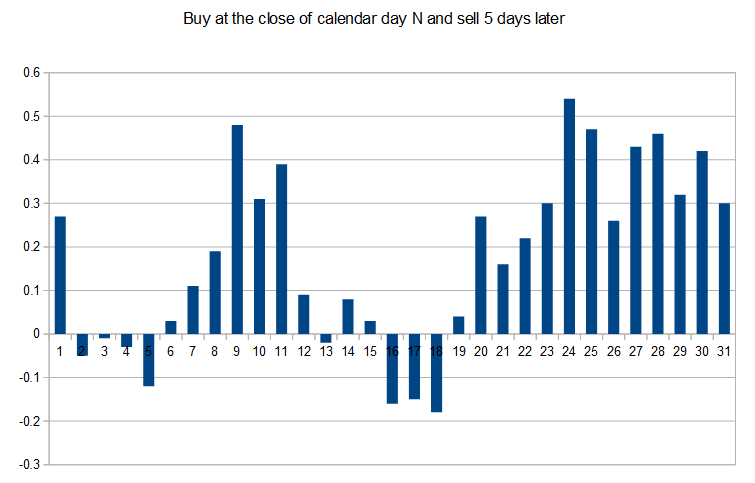 The test period is from January 2000 until today. The left axis shows the average gain in % per trade. The best day is the 24th which has an average gain of 0.53% over the next five days (if you bought the close on the 24th). This is obviously much better than any random day.