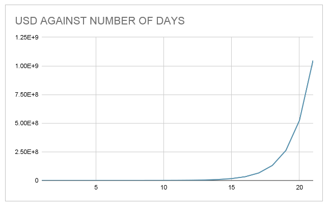 Let us analyze this data plotted in the line chart below. One thing that stands out from the table and chart is that the beginnings were relatively small. You had only 512,000 on the tenth day. You still have just sixteen million on the 15th day compared to the possible billion. But now things start to get interesting when the compounding impact takes effect!