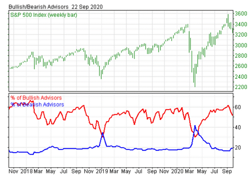 It takes a weekly poll of investment advisors and produces three numbers: the percentage of investment advisors that are bullish, the percentage that is bearish, and those that are expecting a market correction.