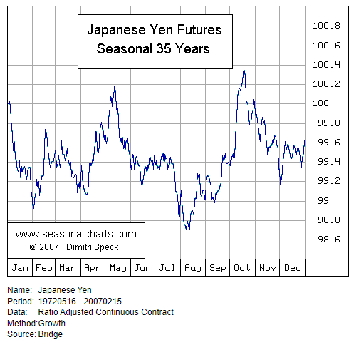 Seasonality in Japanese Yen futures trading suggests better performance during May and October, while performing poorly in July and August.