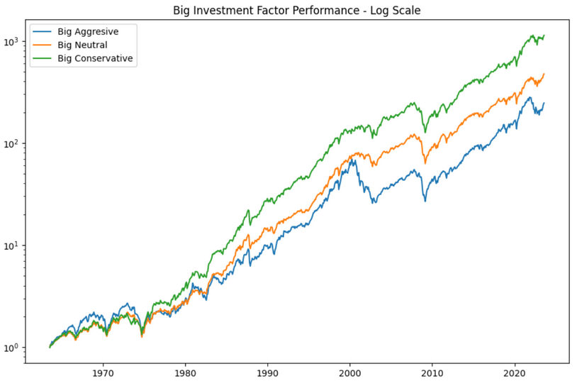 Lastly, we are going to backtest the portfolios based on size and investment. Investment is the change in total assets from the fiscal year ending in year t-2 to the fiscal year ending in t-1, divided by t-2 total assets. Here is the equity curve of this particular big-cap effect and anomaly: