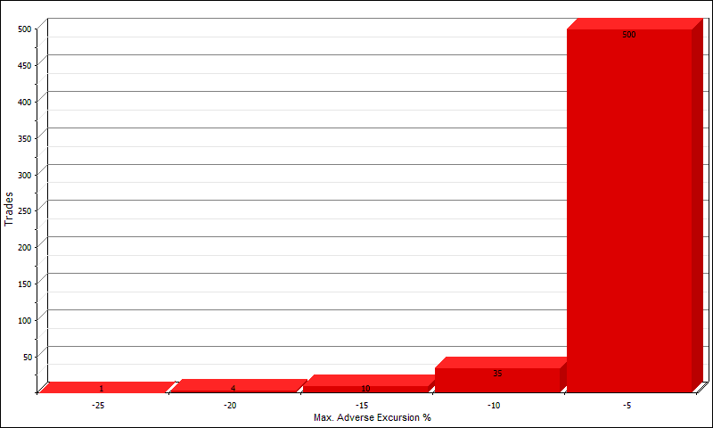 The graph indicates that 50 trades out of 550 had a MAE% in absolute value greater or equal to 5%. If these trades had employed a financial leverage equal to 20 (100/5), the trades would have led to insufficient capital in the account and subsequently to forced liquidation of the position or a margin call.