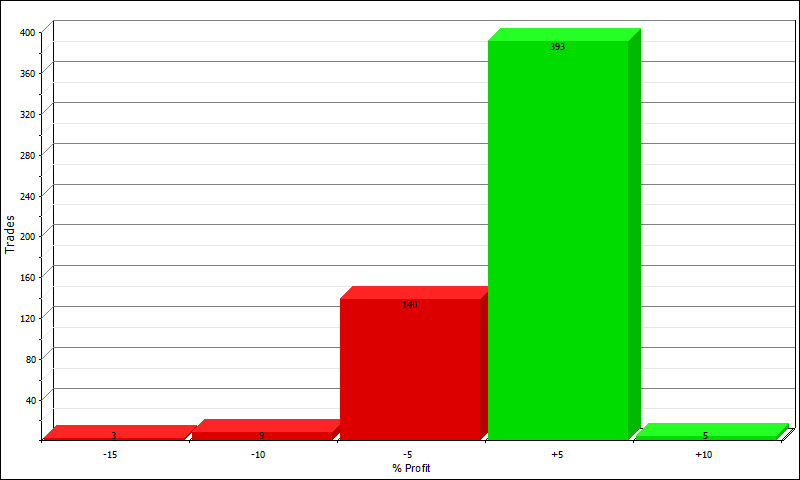 Furthermore, from the Profit/Loss distribution (see next image), you can note that only 12 trades close with a loss greater than or equal to 5%, therefore it is recommended to be sufficiently capitalized to avoid incurring a forced liquidation by the broker which would act like an unwanted stop loss.