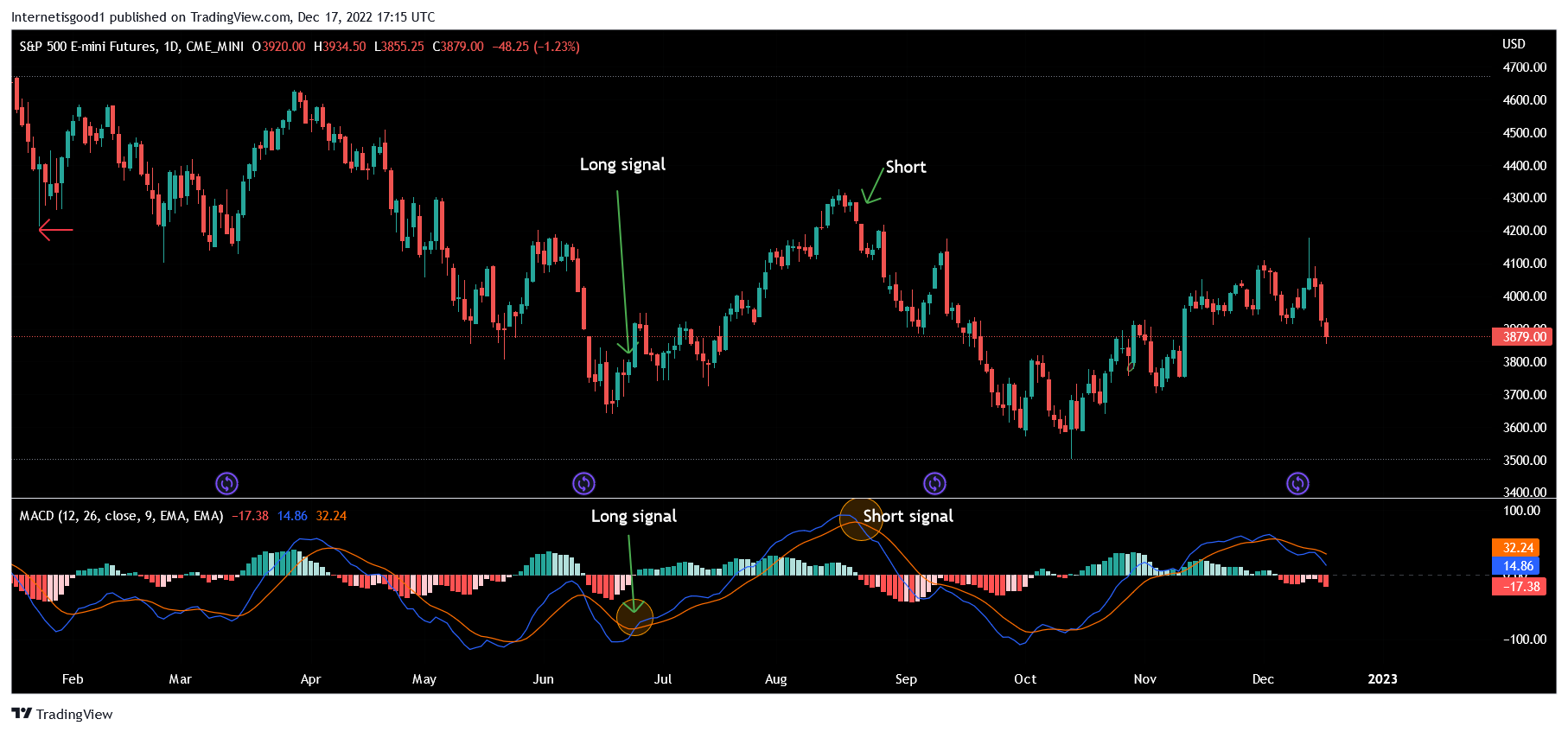 Take a look at the chart below. You can see that the MACD follows the momentum of the market very well. It rises as the market rises and falls as the market falls. We labeled just two signals to show this example.