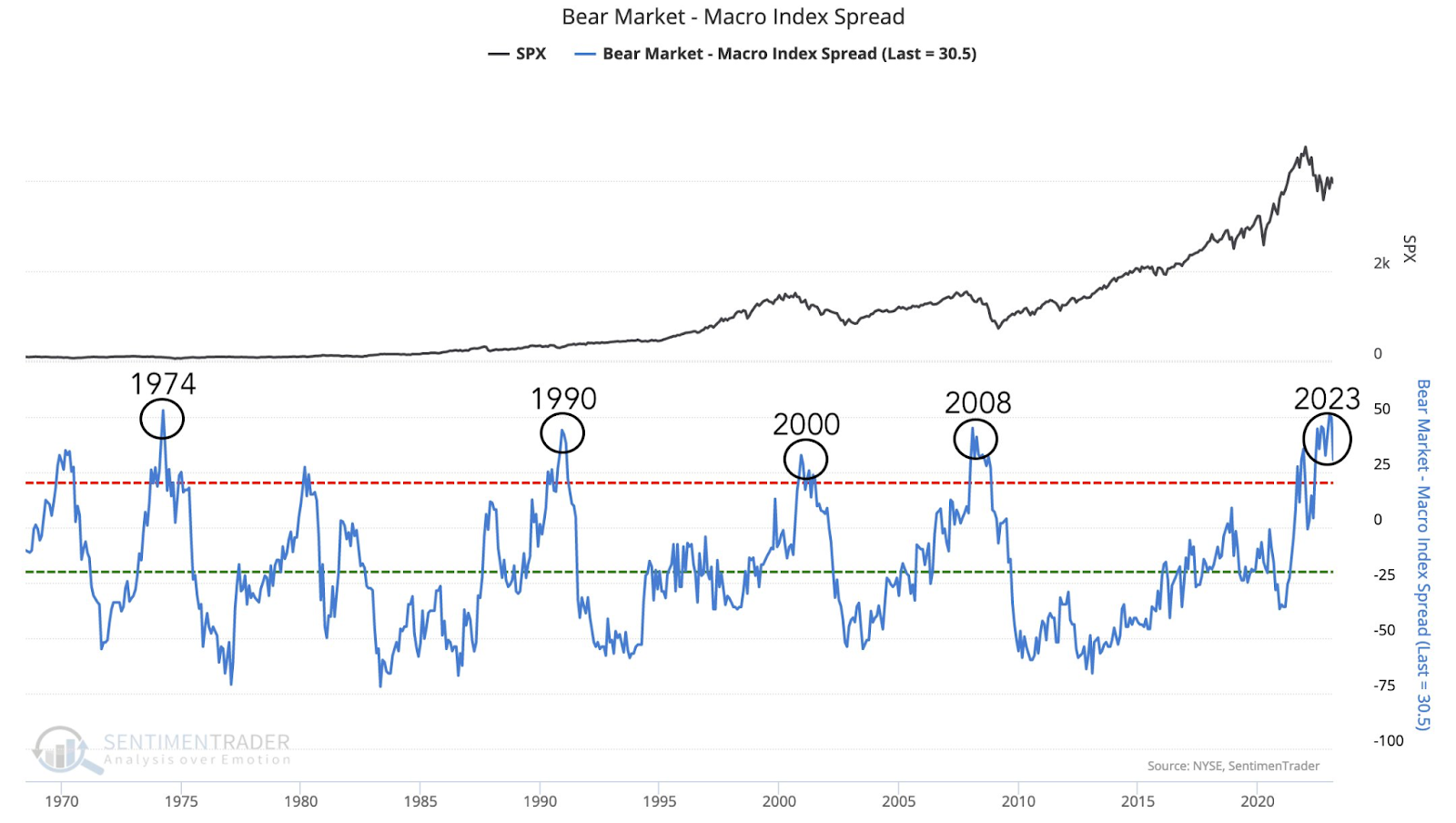 The higher the macro spread index is, the higher the odds of a significant decline in the stock market, usually combined with poor or deteriorating macro conditions.