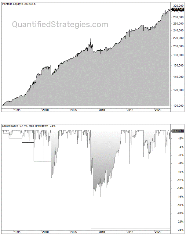 This is all there is to it. If we backtest that strategy on SPY (S&P 500) we get the following equity curve: