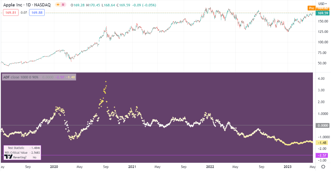 There is some relatively complex mathematics underlying the ADF test, which we won’t go into here, but as with most trading indicators, it can be calculated through an indicator on a trading platform such as TradingView.