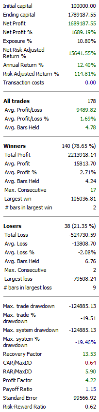 Worth noting is that the profit factor is very high, drawdown is much less than buy and hold and CAGR of 12.4% is substantially above buy and hold’s 9% (including reinvested dividends):