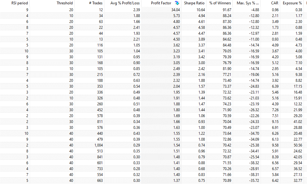 Columns 1 and 2 show the different RSI levels and thresholds for buying. For example, row 1 shows the result when we use a 9-day RSI of the OBV indicator and we enter when the RSI level crosses below 20.