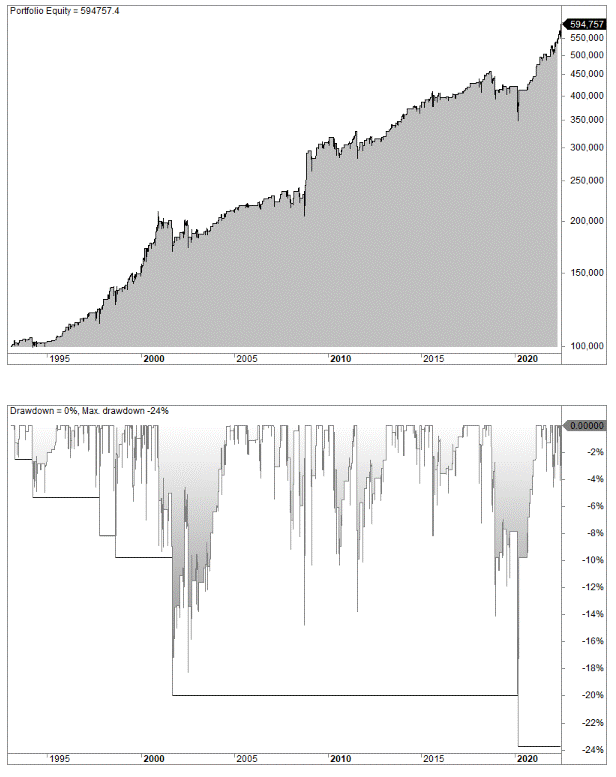 Let’s pick one of the options from the backtest optimizations: a 5-day RSI and a buy threshold of 30. We get the following equity curve:
