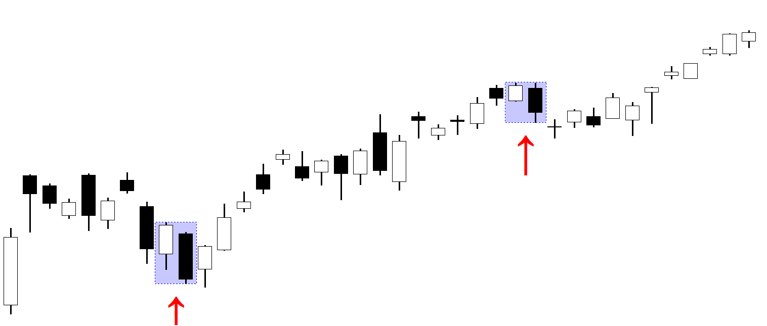 - A long bearish candlestick: The second candlestick in the pattern is a long bearish (black, red, or whatever bearish color) candle that opens within the body of the preceding bullish candle and closes below its low.