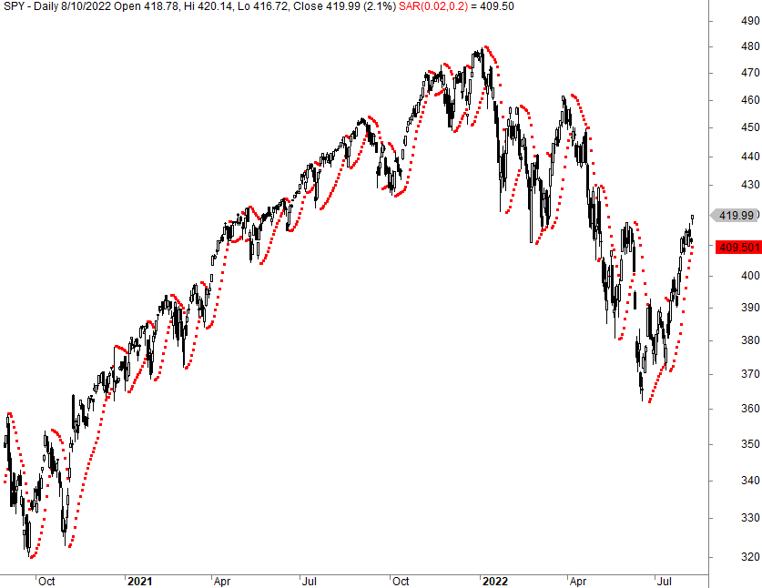 First, it tells you where the market is likely headed (up or down) — this is shown as a series of dots above or below the market depending on the current trend. Secondly, it attempts to tell you at what point the current trend will likely reverse. Lastly, it can tell you potential entry or exits based on a market trend reversal.