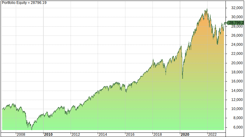 We backtested The Second Grader’s Starter Portfolio using a “buy and hold” strategy that we rebalanced at the beginning of each year. For backtesting, we used the ETFs we picked with the appropriate weights. The backtesting interval is from 2007 to 2023.