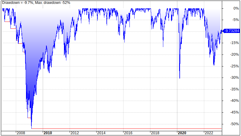Below is the portfolio’s underwater curve (drawdowns). A drawdown refers to the decline in value from a relative peak value to a relative trough. A maximum drawdown is the maximum observed loss from a peak to a trough of a portfolio before a new peak is attained: