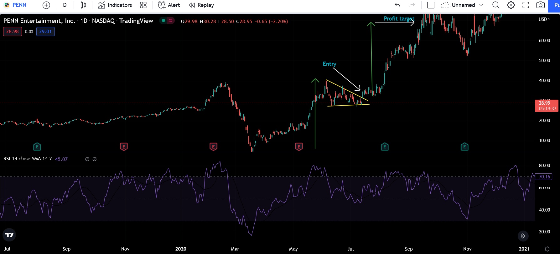 An example of a bullish pennant trading strategy with buy signal and profit target.
