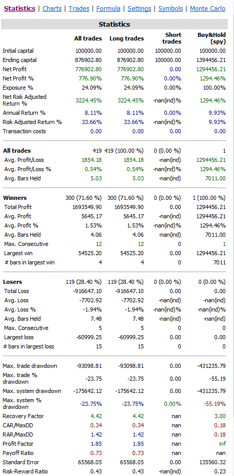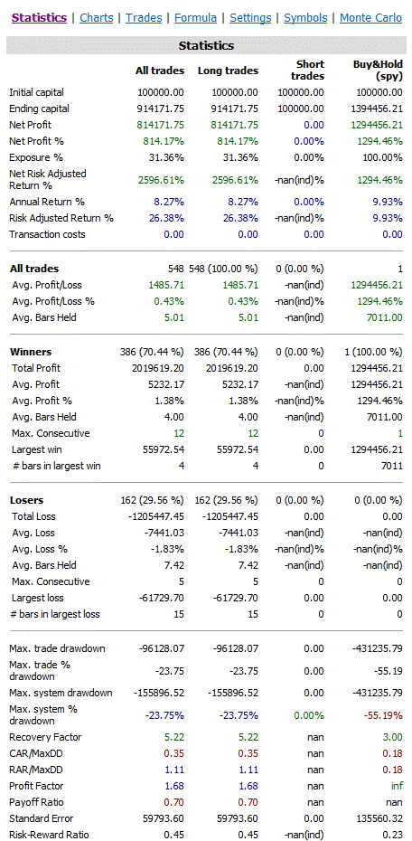 The strategy goes long when today’s close has dropped more from yesterday’s close than the 100-day average difference of the high minus the low. The strategy is of course very similar to the RSI strategy and returns a pretty similar result: