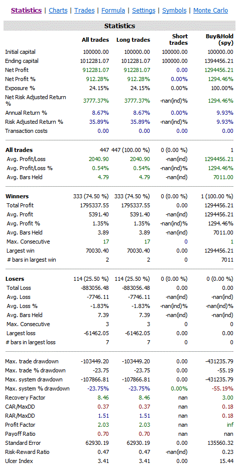 The strategy goes long when today’s close has dropped more from yesterday’s close than the 100-day average difference of the high minus the low. The strategy is of course very similar to the RSI strategy and returns a pretty similar result: