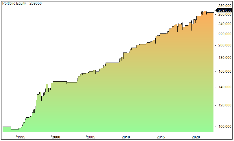 The 100 000 invested in 1993 grows to 269 000, something that is 3.3% annually. That might not look very impressive, but the strategy is invested only 5% of the time. If we adjust for that and calculate the risk-adjusted return, it is a more impressive 61%. This means you have resources to add complementary trading strategies.