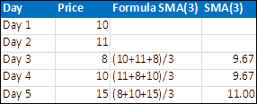 On Day 5 there are two important values, the price = 15, and the SMA(3) = 11.00; when the price is higher than the SMA it is assumed there is an upward trend. In case the SMA is lower than the price it is assumed there is a downward trend.