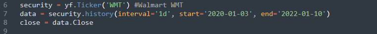 We use the yfinance package to download historical prices of Walmart security (WMT). The data starts on 2020-01-03, and ends on 2022-01-10. The frequency is daily: