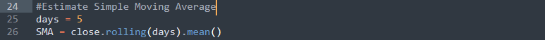 We apply the function “.rolling(days).mean()” to the pandas series variable close, and we will obtain a series with the moving average of the last 5 days.