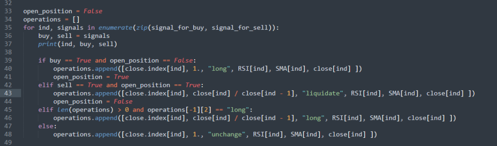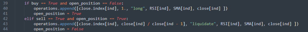 We will add data to our list operations when the variable buy is True and at the same time, open_position is False, while we will close our position when sell is True and open_postion is True.