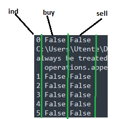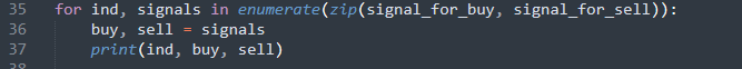 Now is the moment to break down the previous image. The loop will iterate over the variables signal_for_buy and signal_for_sell, the enumerate built-in function will generate the variable ind: